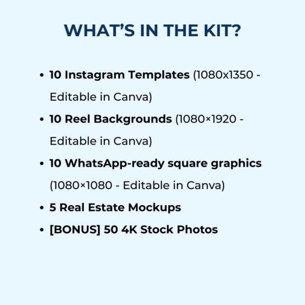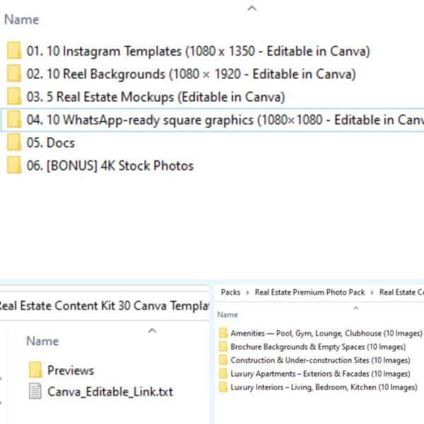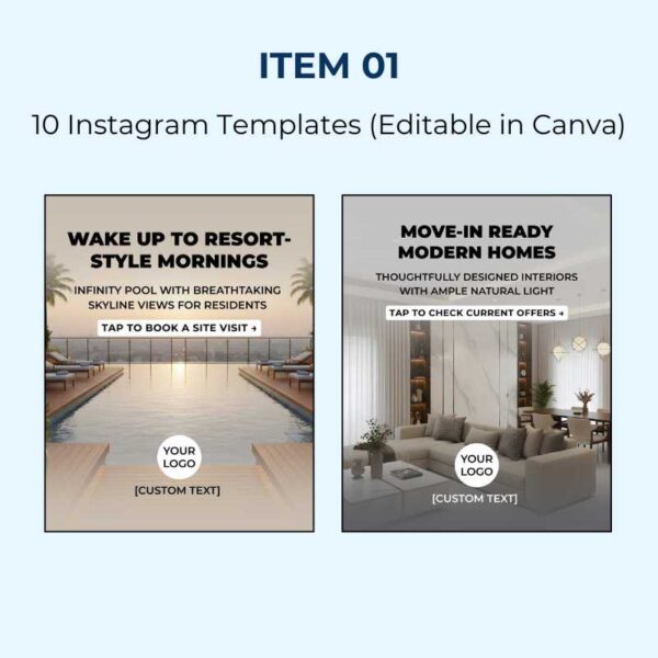 Real estate marketing kit with 30 editable templates (Instagram posts, Reels and WhatsApp graphics), mockups and 4K photos to help agents, builders, designers and marketers create professional property content in minutes—no design skills needed.